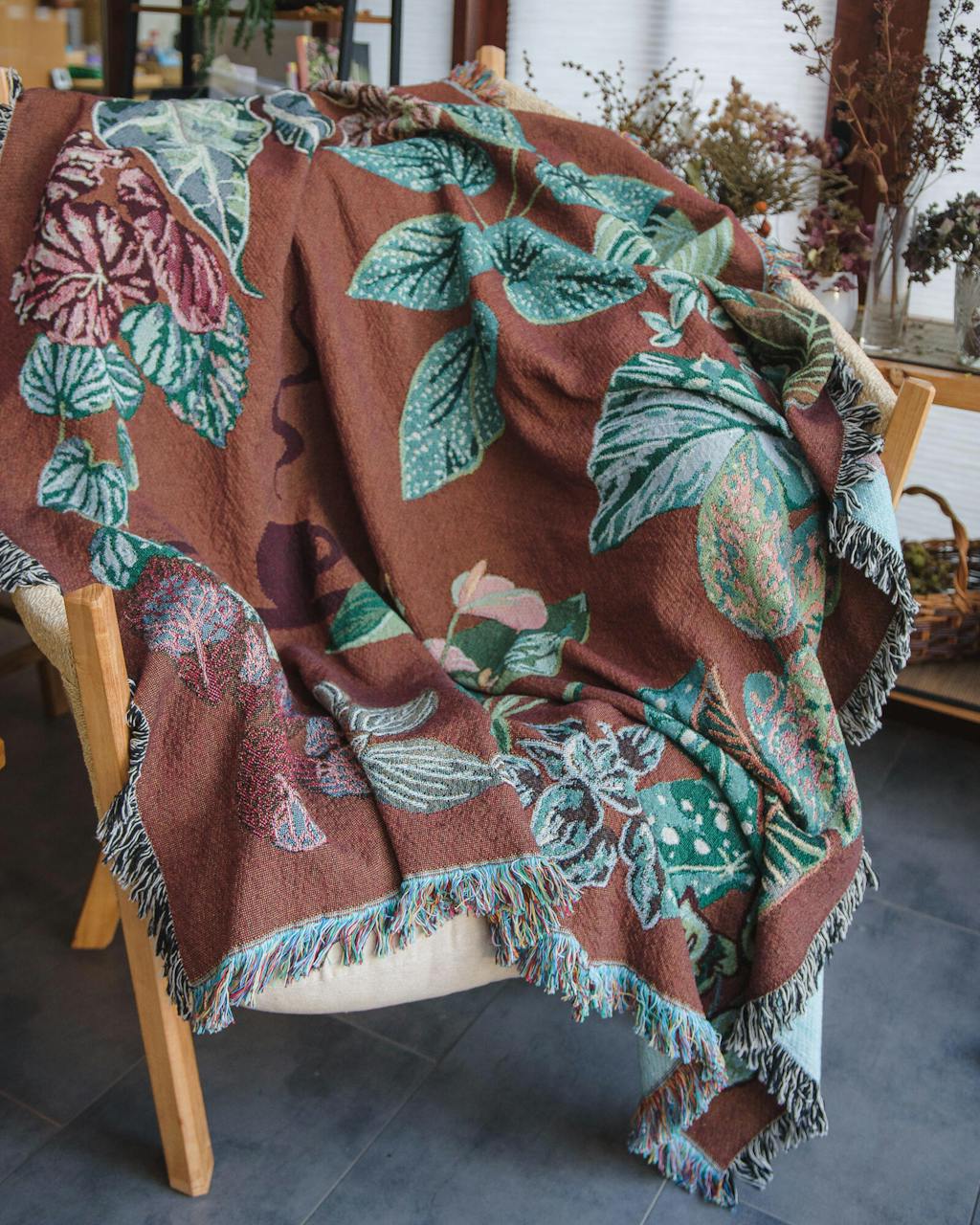 Woven throw blanket with fringe, featuring houseplants in stunning detail