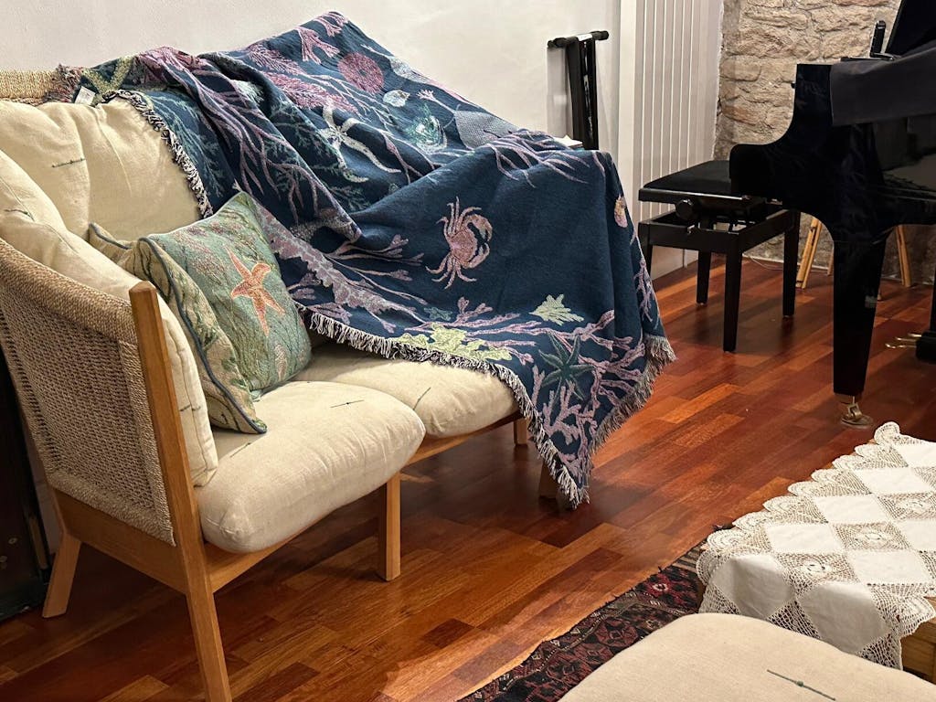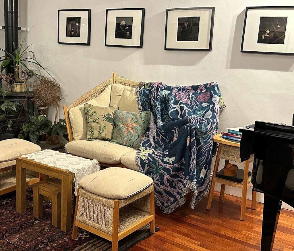 I love the Intertidal blanket, I wrap it around me when I am relaxing on a sofa buried in a book or watching a TV show. The rest of the time, it adorns our music room sofa perfectly! I also hugely appreciate the text that accompanies Ria’s products – very interesting and educational.