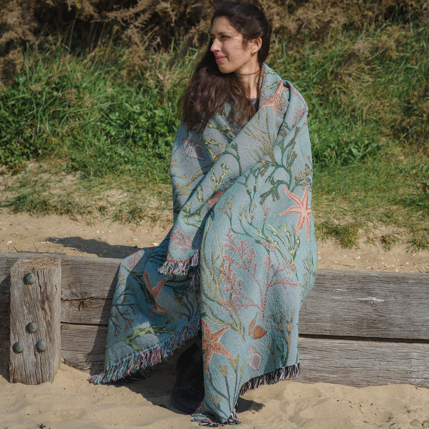 The intertidal zone, a place submerged in water at high tide and exposed at low tide, is a unique environment where you’ll find a wealth of creatures and plants seeking refuge in rock pools. This woven blanket celebrates some of these beautiful jewels of the coastal change, from seaweeds to sea snails and sea stars.