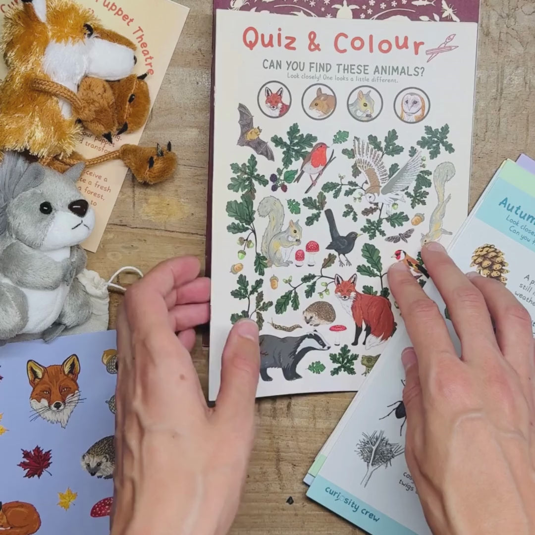 Each box includes a 'Discovery Tales' 12 page Science-through-story book, 7 double-sided activity cards on the themes of Nature Search & Spot, Nature Observation, Test & Discover, Make & Create, Imagine & Move, Puppet Play, a 'Quiz and Colour' 8 page book, decorative sticker sheet, a soft animal finger puppet and a collectible woven iron on animal badge.