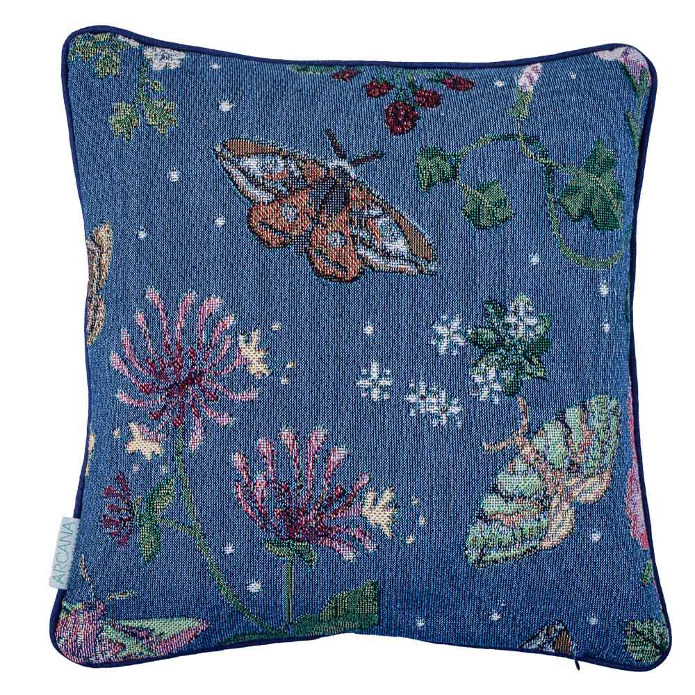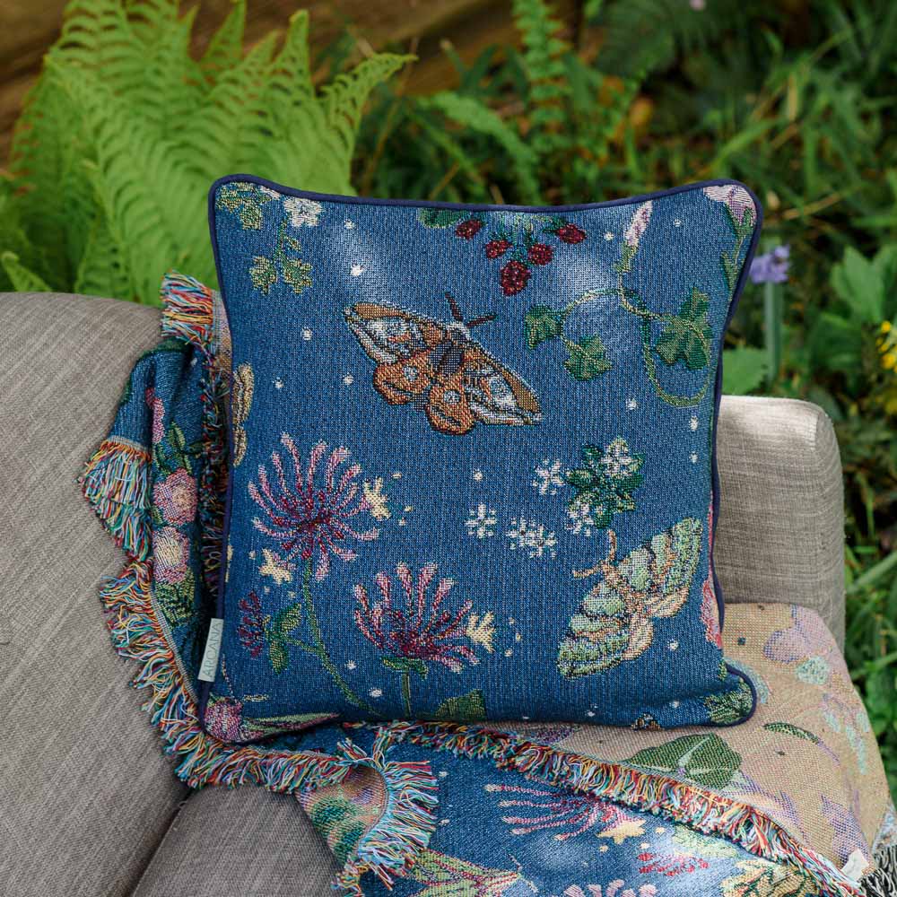 This cushion features the Little Magpie moth and bindweed, a food plant of it's hungry caterpillars.