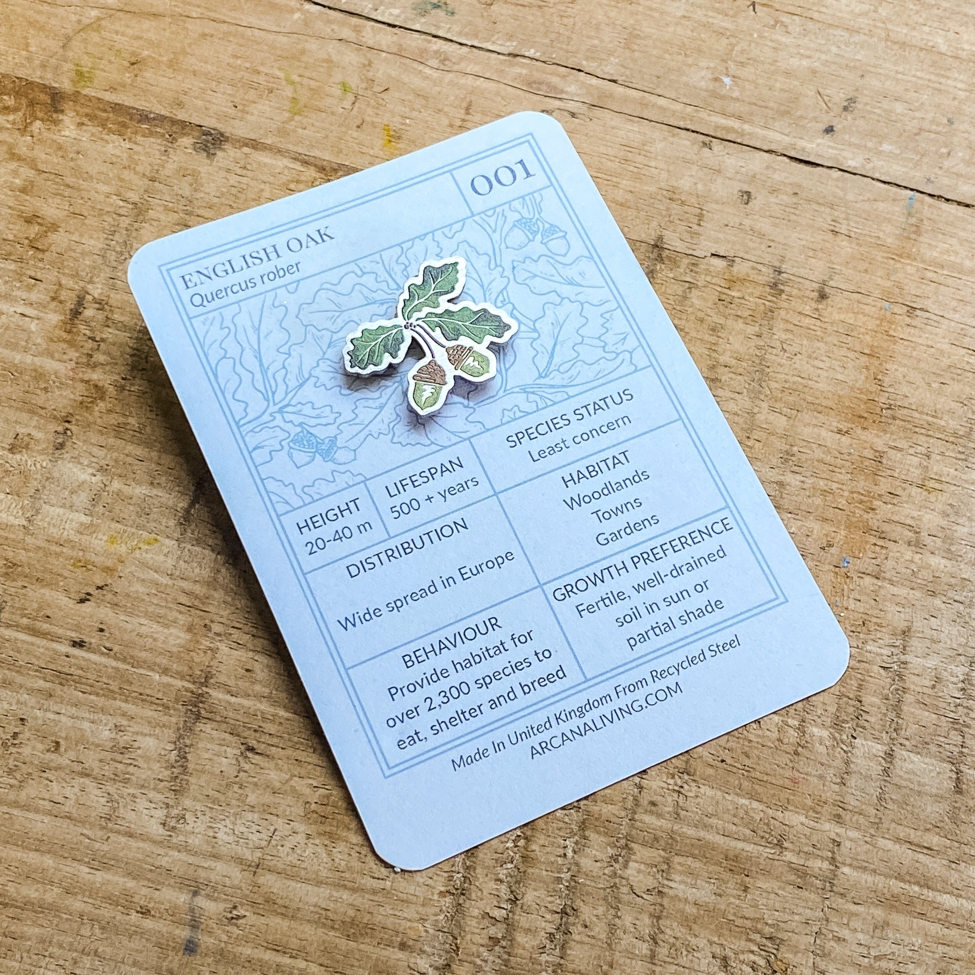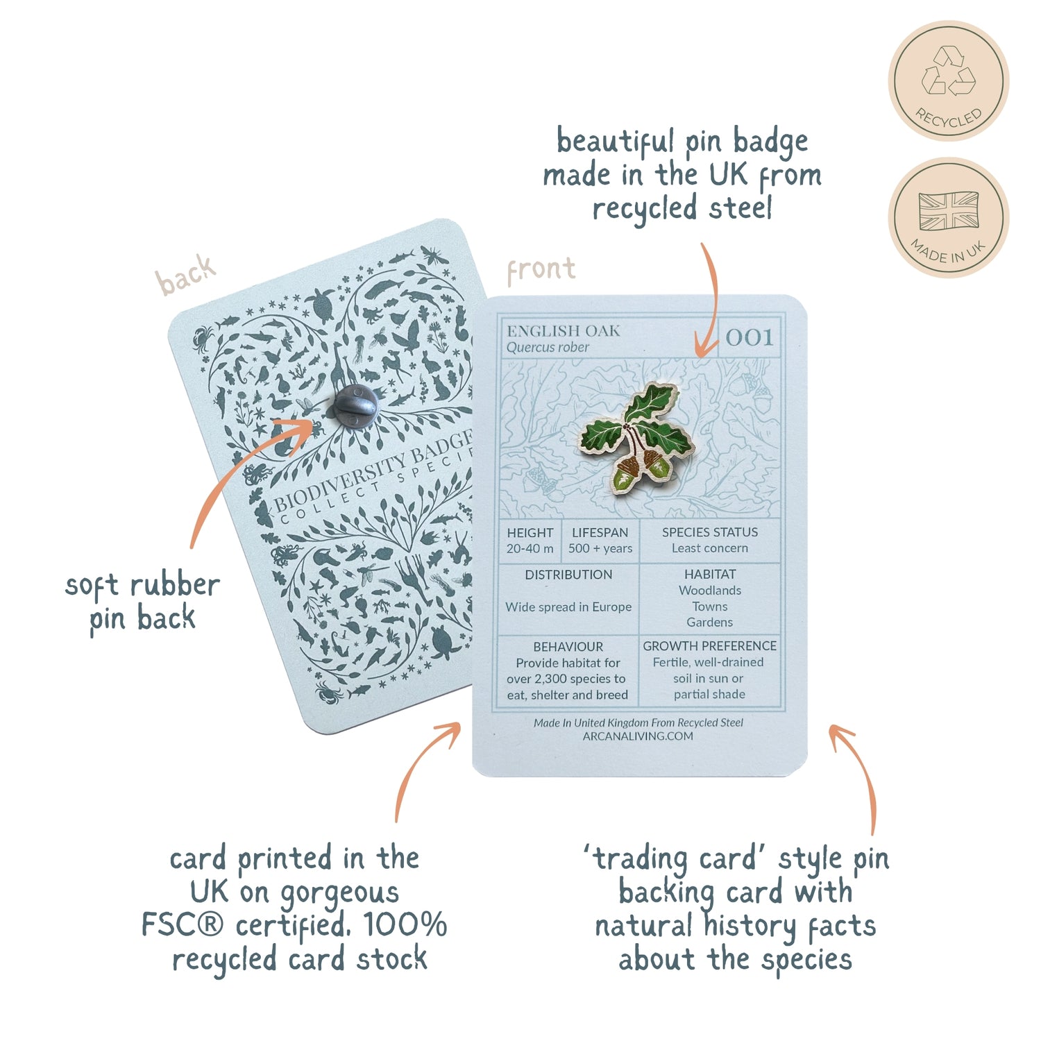 Crafted in the UK from recycled steel, our highly collectible Biodiversity Badges feature different species. Presented on a ‘trading card’ style backing card with natural history facts about the species. Each one is sent in a biodegradable cello bag to keep it safe in transit.