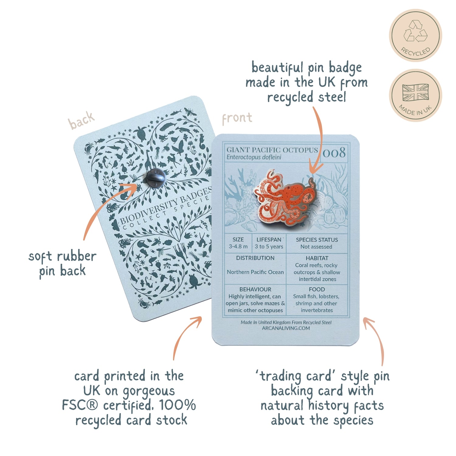 Crafted in the UK from recycled steel, our highly collectible Biodiversity Badges feature different species. Presented on a ‘trading card’ style backing card with natural history facts about the species. Each one is sent in a biodegradable cello bag to keep it safe in transit.