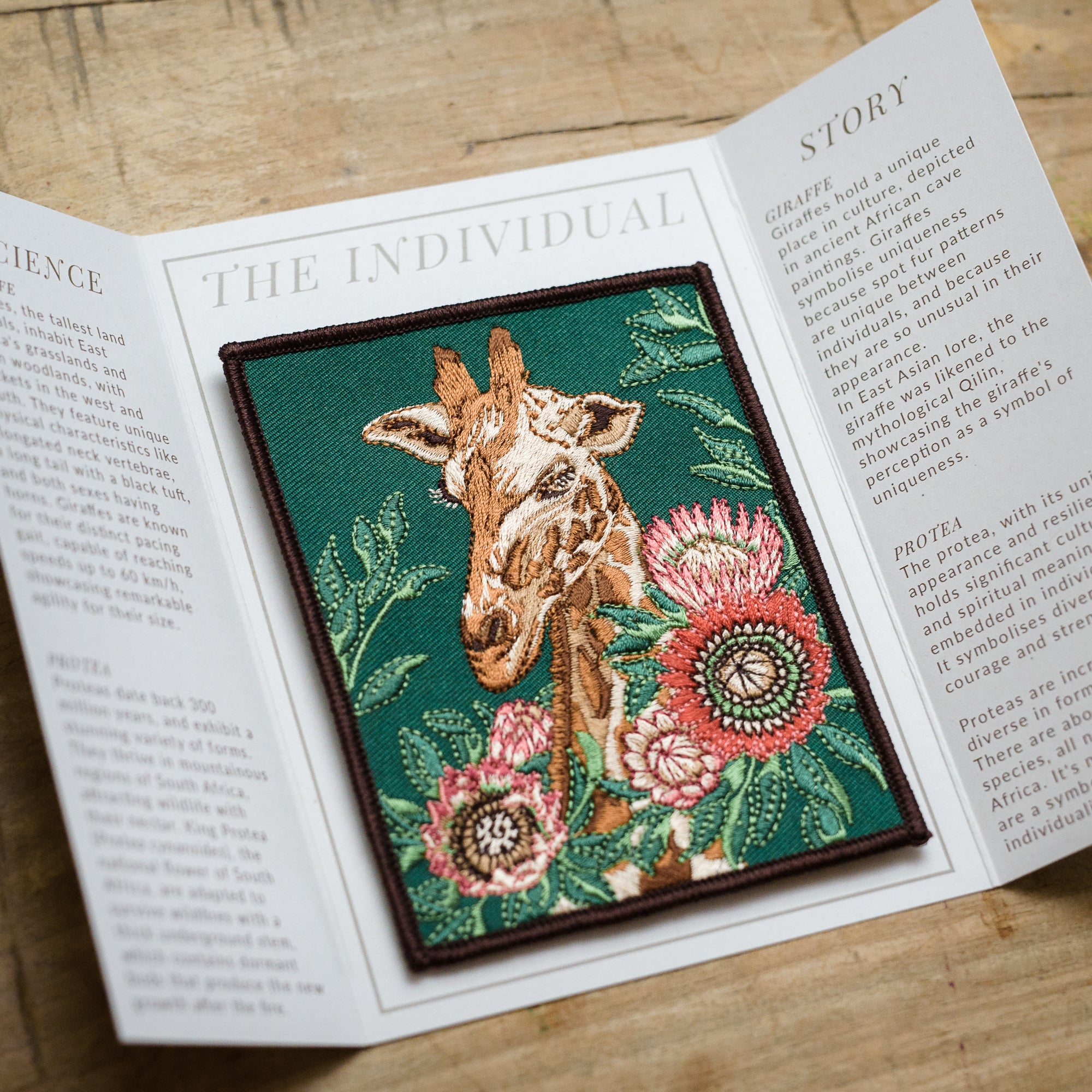 'THE INDIVIDUAL’ embroidered art patch features the Giraffe and Protea, symbolises uniqueness, standing out, and thriving under any circumstances.