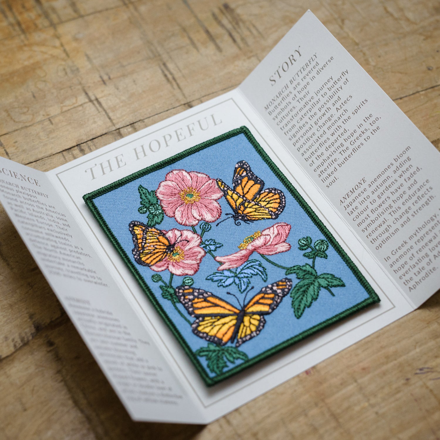 Monarch butterfly and Anemone flower Embroidered Patch in gatefold card with science and story behind the species