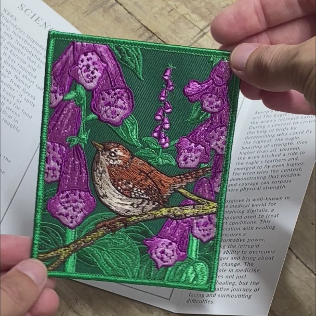 'THE INTREPID’ embroidered art patch features the Wren and the Foxglove.