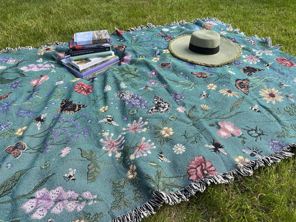 A summer garden, overflowing with colour, brought to you in woven wonder. The Pollination Bloom blanket features artwork with a multidirectional design, so it can be rotated any way. With a deep teal green base it captures the energy of pollinators busily enjoying flowers in full bloom.