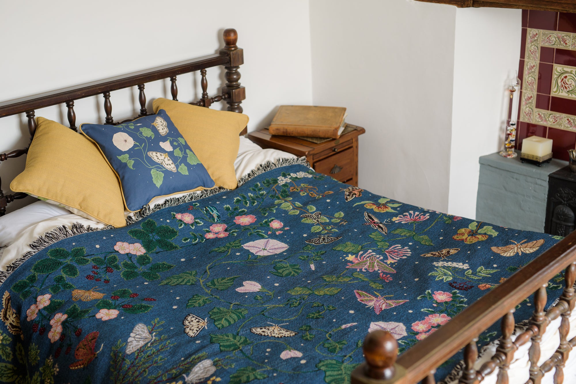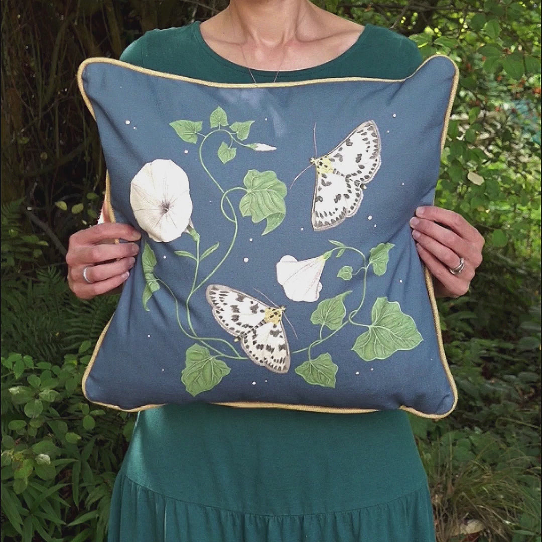 This cushion features the Little Magpie moth and bindweed, a food plant of it's hungry caterpillars.