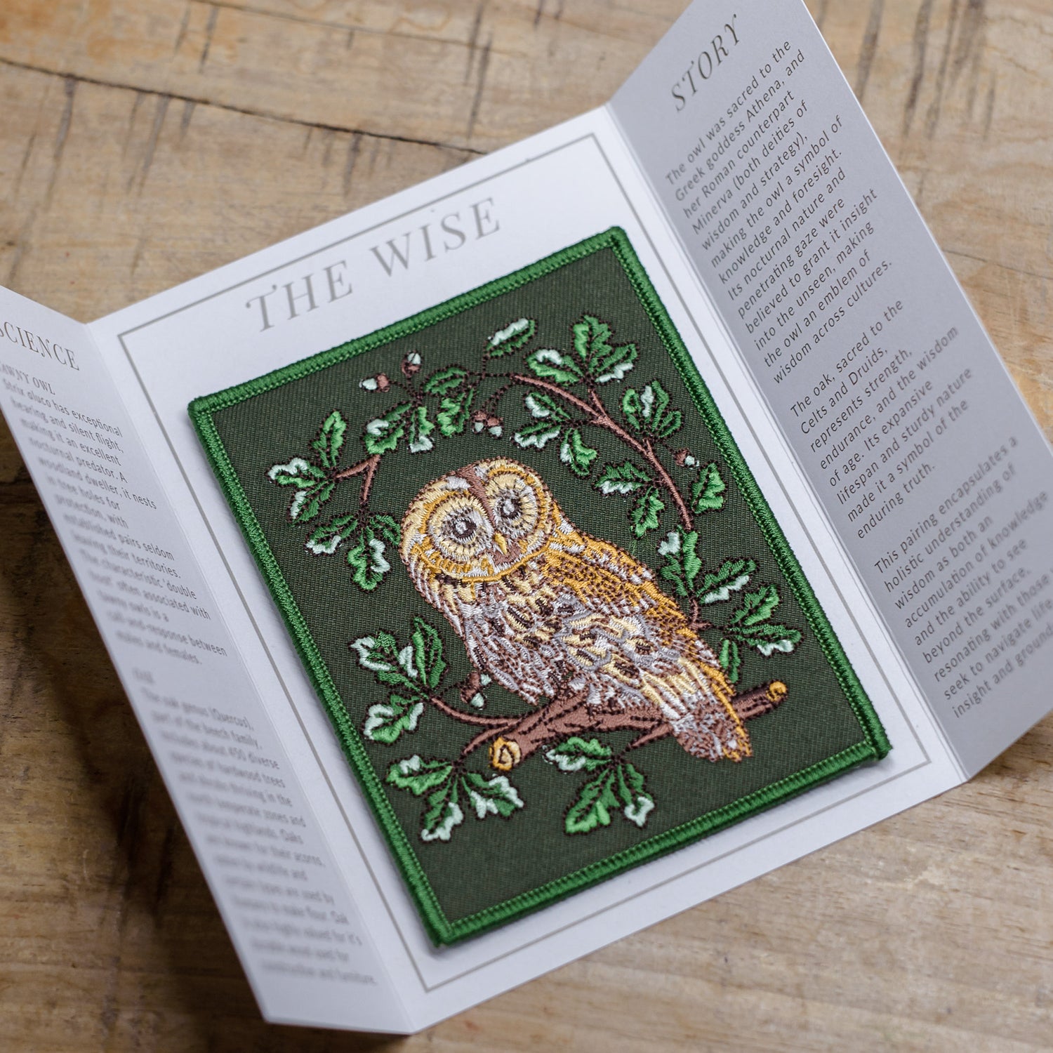 'THE WISE’ embroidered art patch features the Tawny Owl and the Oak Tree. This pairing encapsulates a holistic understanding of wisdom as both an accumulation of knowledge and the ability to see beyond the surface, resonating with those who seek to navigate life with insight and groundedness.