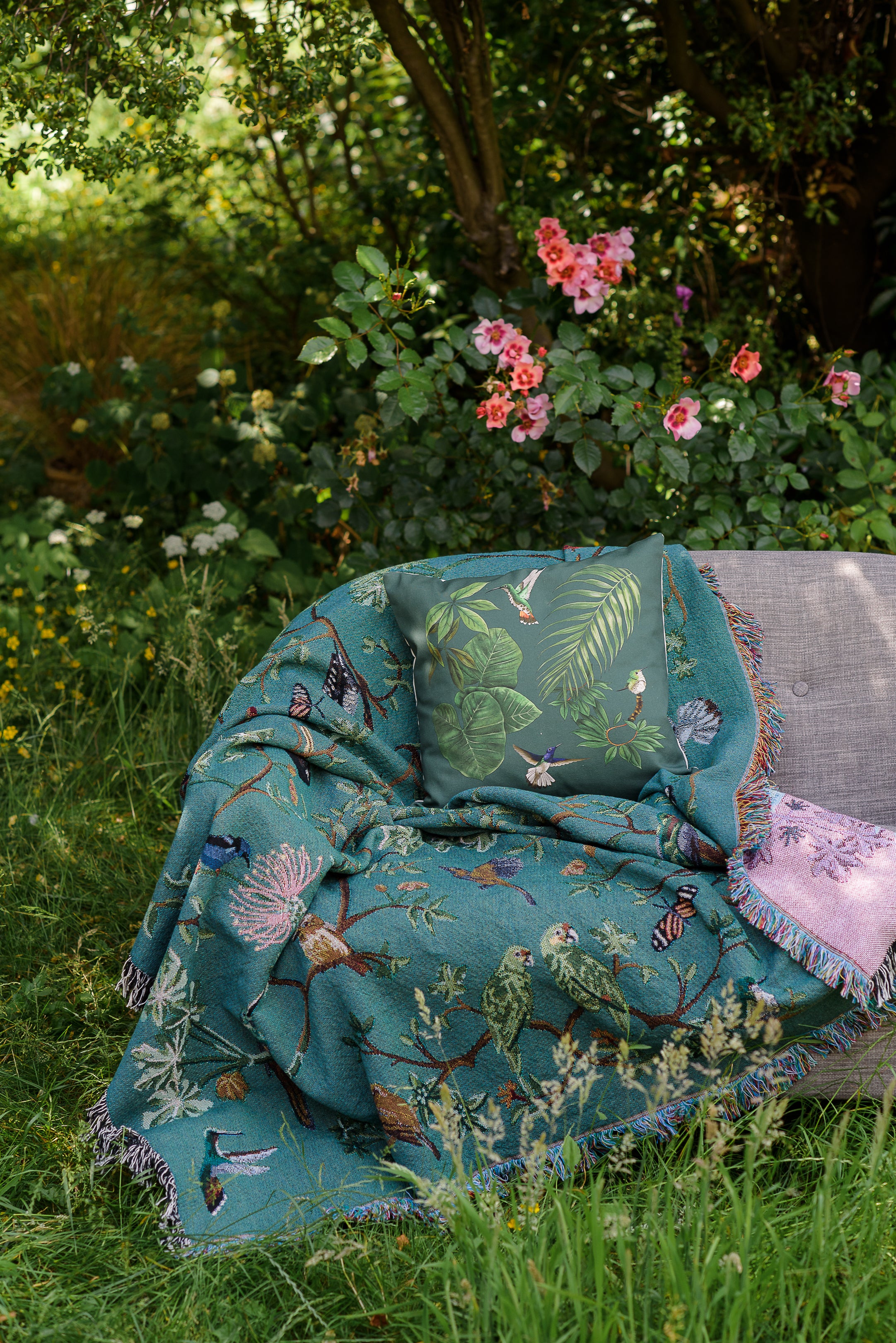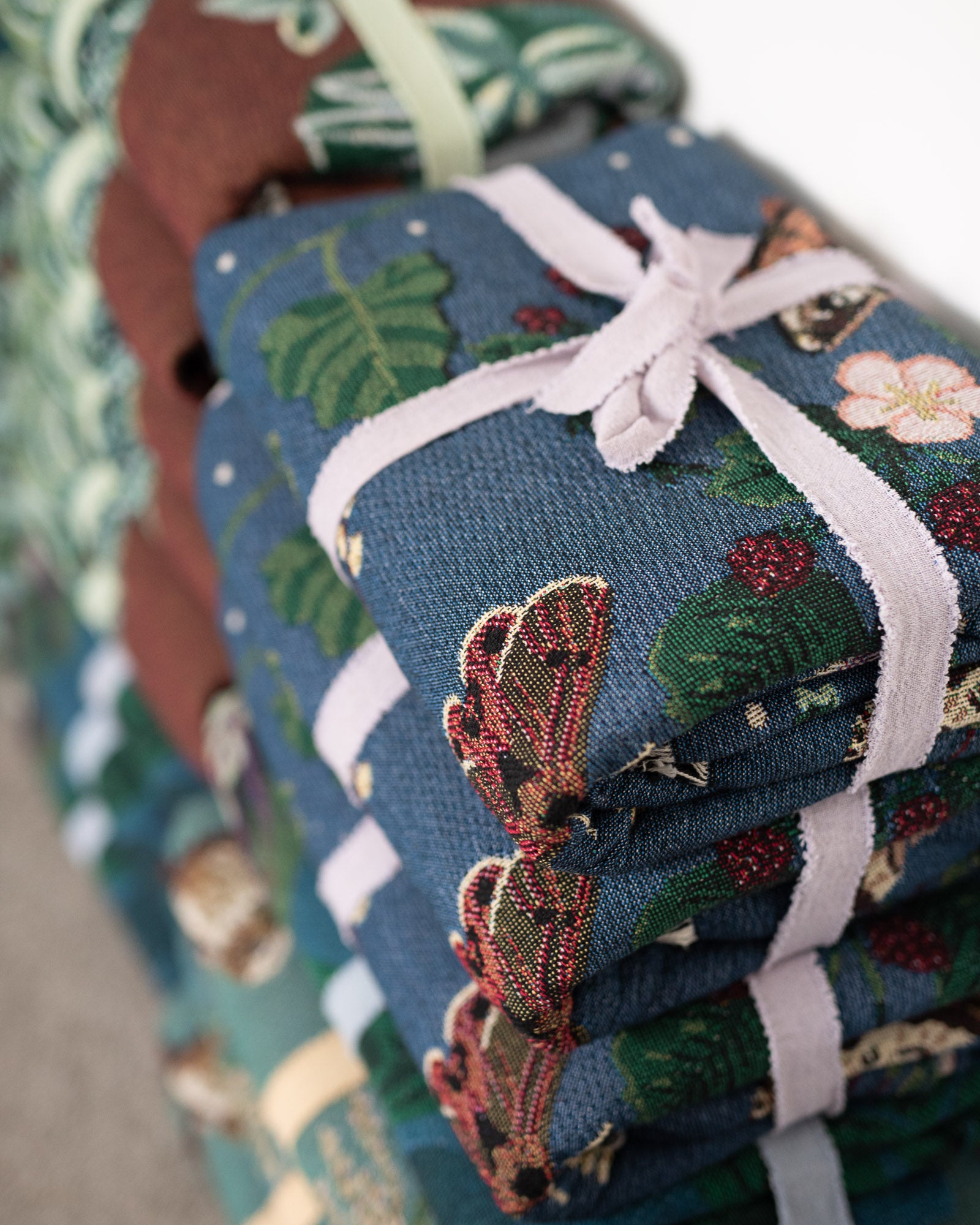 Our cushion covers are made from the same woven fabric as our blankets, or from 100% organic panama cotton printed in the UK. They are piped with 100% recycled linen or zero waste fabric made in UK.